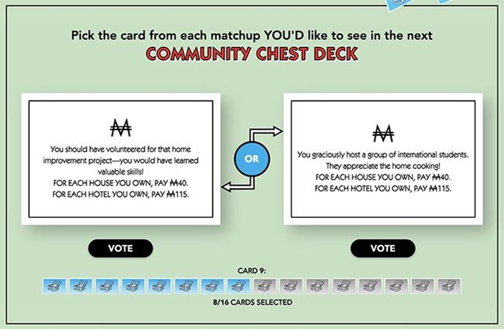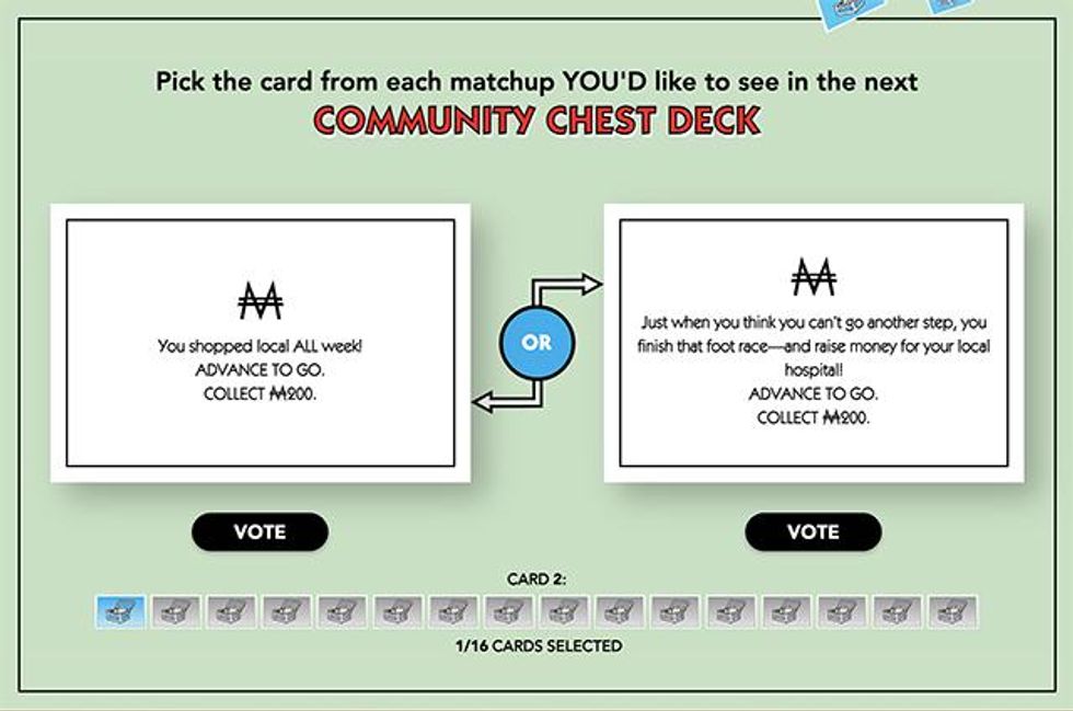 The world has changed a lot since Monopoly became a household name more than 85 years ago, and clearly today community is more important than ever. We felt like 2021 was the perfect time to give fans the opportunity to show the world what community means to them through voting on new Community Chest Cards. We're really excited to see what new cards get voted in!