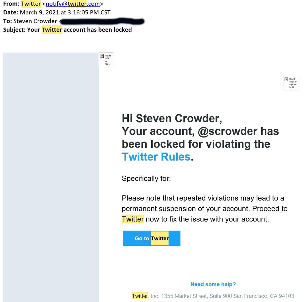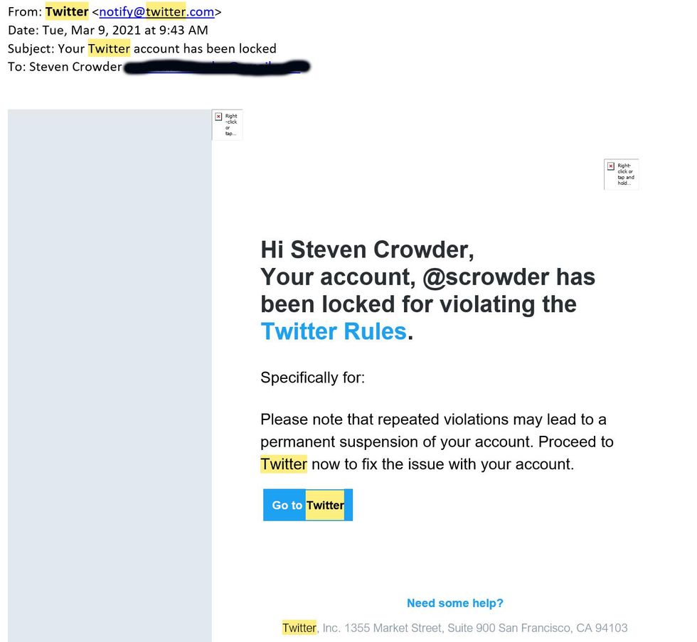 Twitter has once again suspended Steven Crowder's account (@scrowder) without explanation. This previously happened on February 23, also without explanation, but the account was reinstated after twelve hours. Attorney Bill Richmond will be on Louder with Crowder on March 11, at 10:00 a.m. Eastern to give a legal update on Twitter's violation of its own rules. Richmond will also be explaining how this is a violation of California law that falls outside any Section 230 protection.