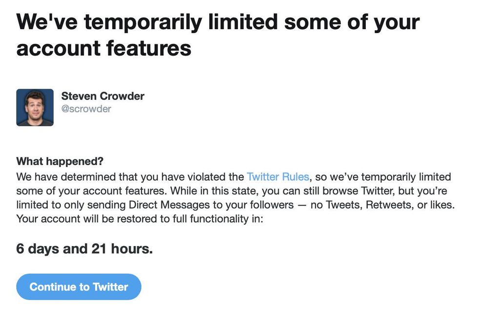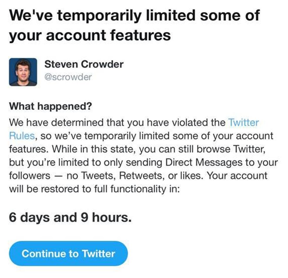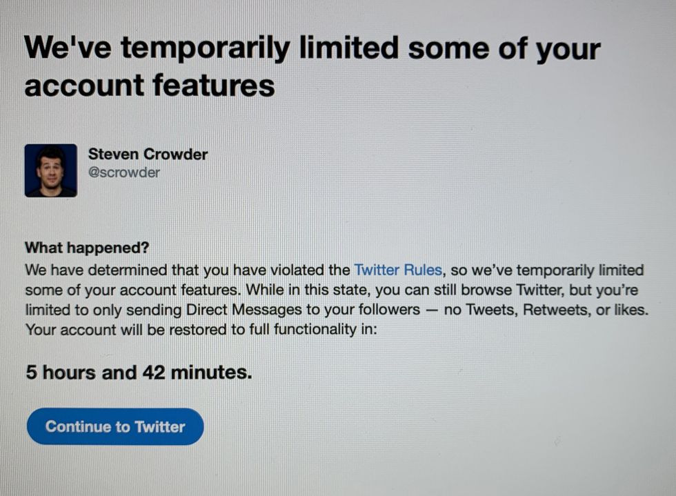 On March 10 at 5:10 a.m., the time until Crowder's Twitter account was to be restored INCREASED to six days and nine hours. Again, no specific tweets were mentioned that broke any of Twitter's guidelines.